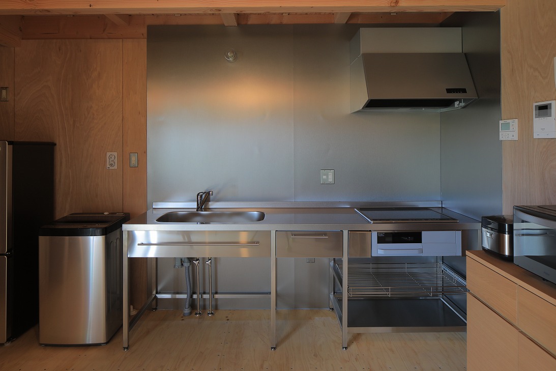 無駄を省いたステンレスのキッチンが、空間にすっきりとした印象を与えます。