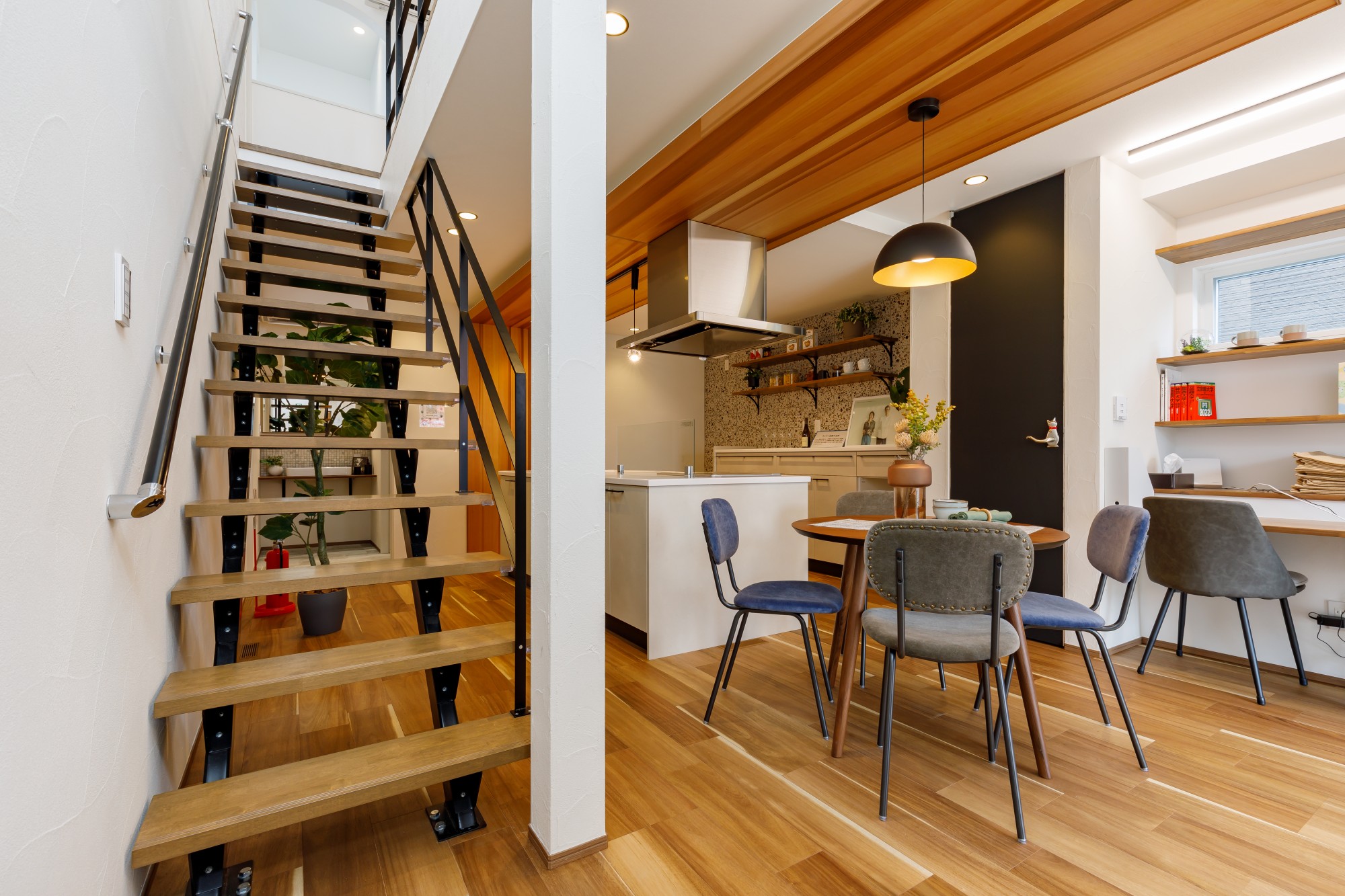 吹き抜け階段と勾配天井の木目が心地よく調和するLDK。