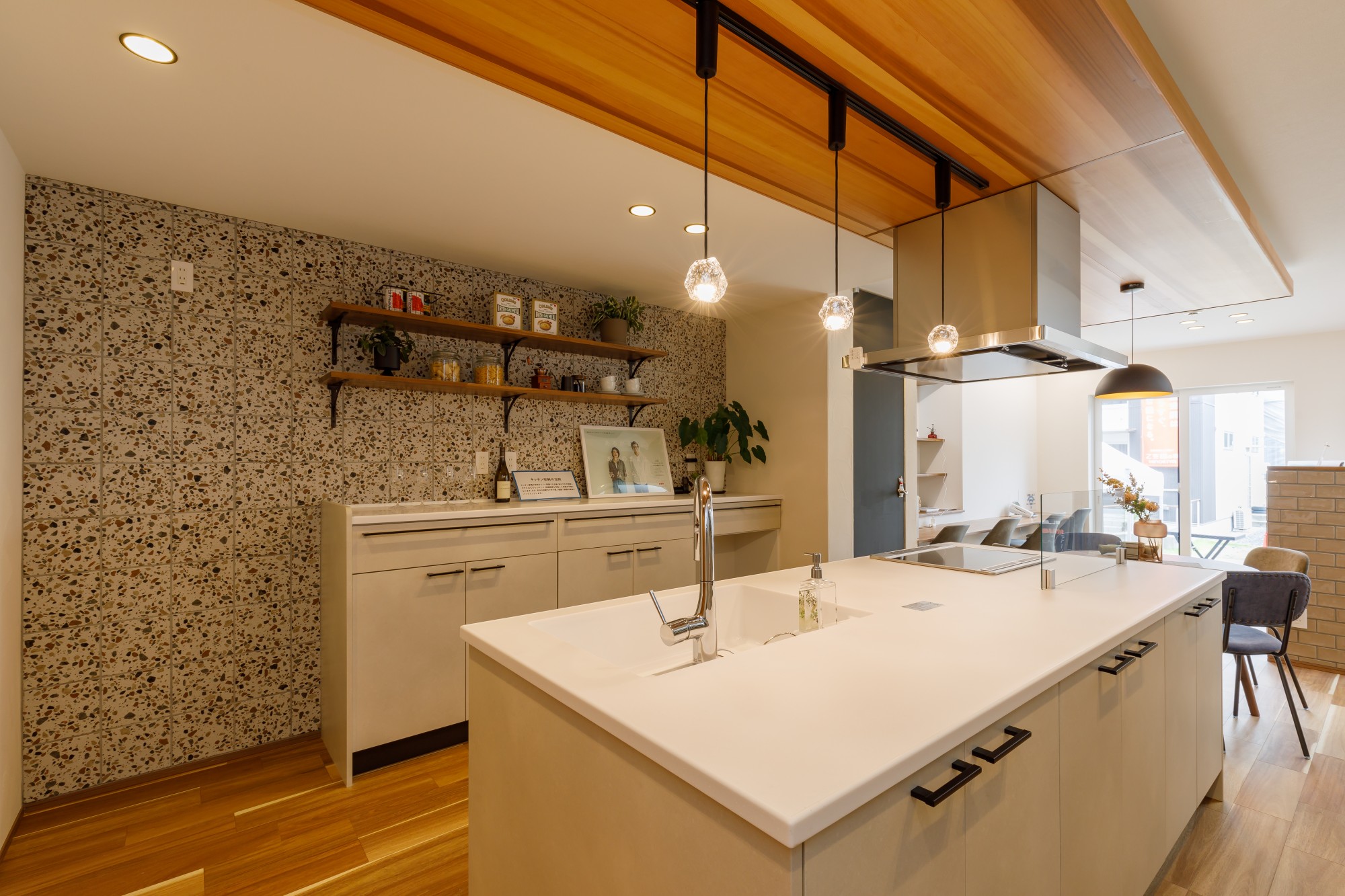 背面のタイルと木製棚がインテリアのアクセントになり、毎日の料理時間を特別にしてくれます。