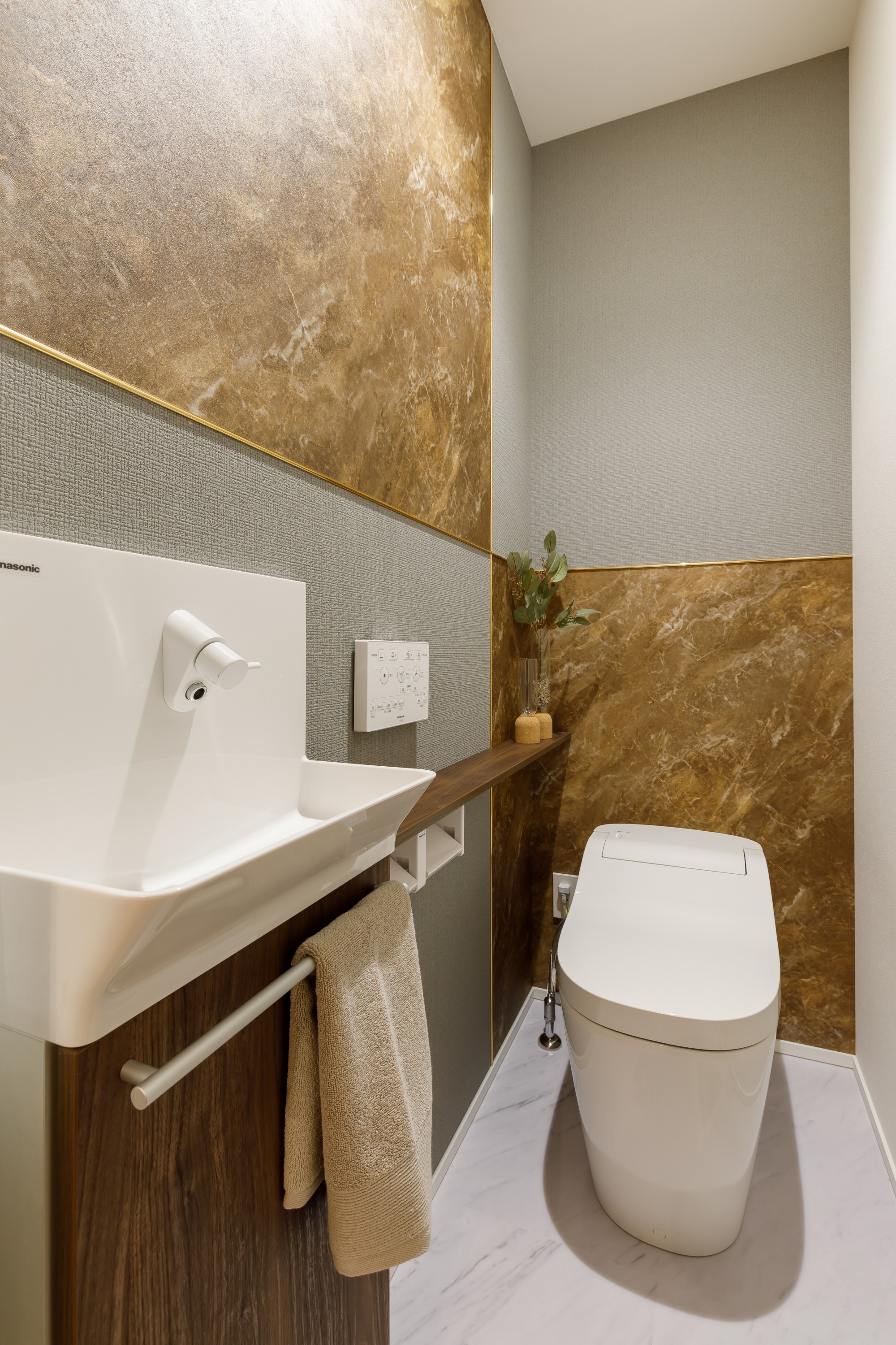 木目と石目のコントラストが美しく、リラックス感のあるトイレに仕上げました。