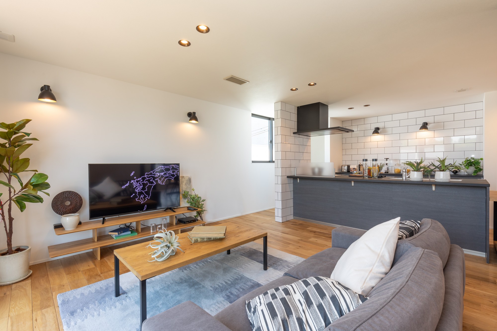 木のあたたかみと無機質な素材のコントラストが美しいLDK。無垢のフローリングやアイアン脚の家具など、素材の風合いを活かしたインテリアでまとめることで、シンプルながらも味わいのある空間に仕上げました。