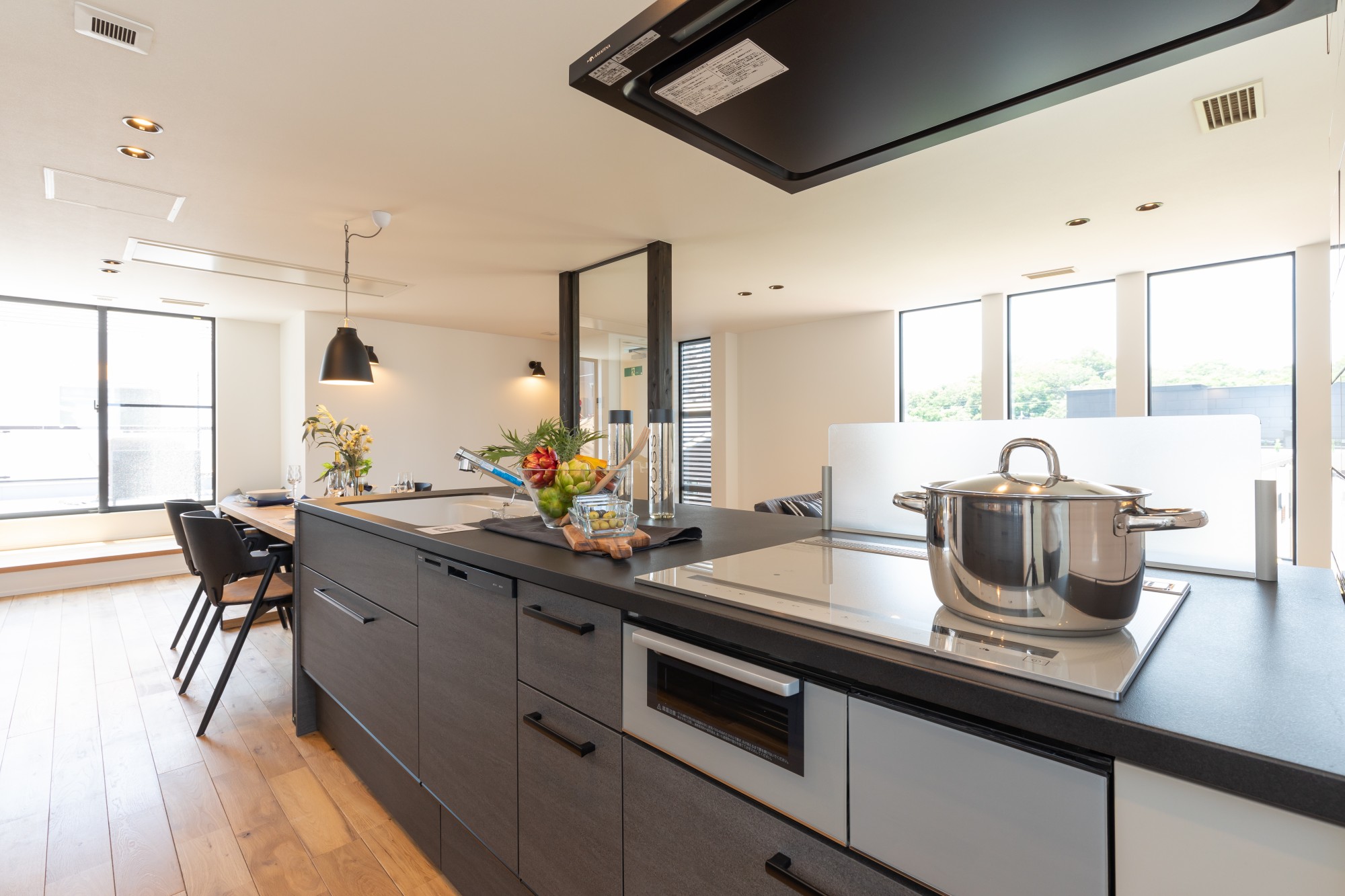 ダークトーンのキッチンと木の床のコントラストが美しく、シンプルな中に上質さを感じさせる空間です。