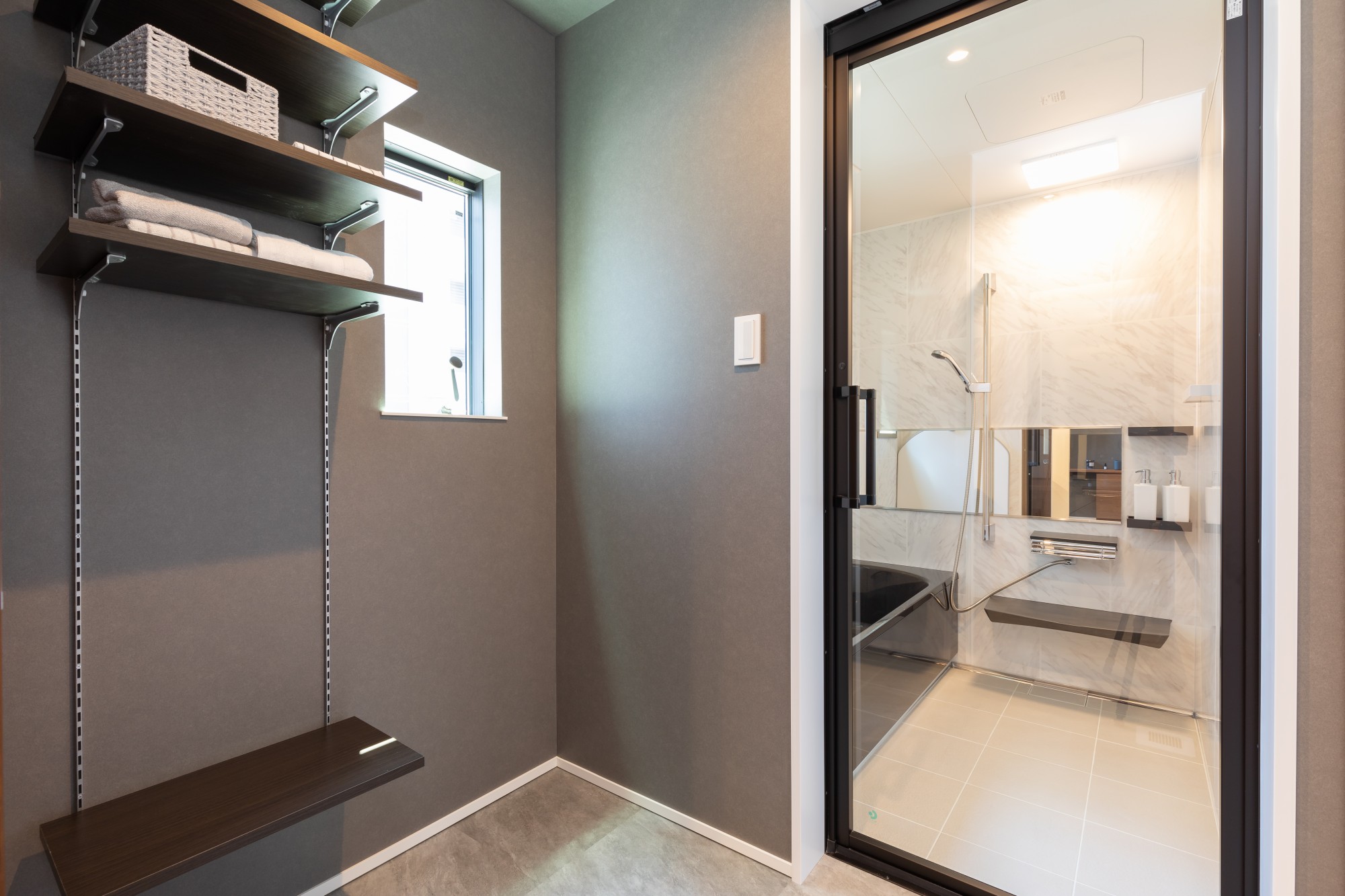 グレーとホワイトを基調にした落ち着きのある水まわり。オープン棚にはタオルやバスグッズをすっきり収納でき、ガラス扉の向こうには広々とした浴室が続きます。
