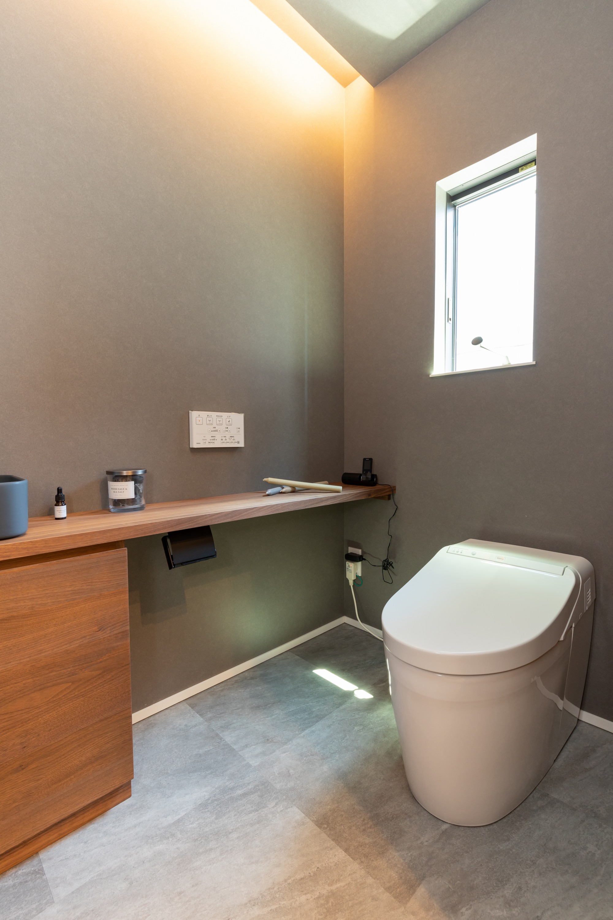 グレーの壁と木目のカウンターが調和する、落ち着いた印象のトイレ空間。