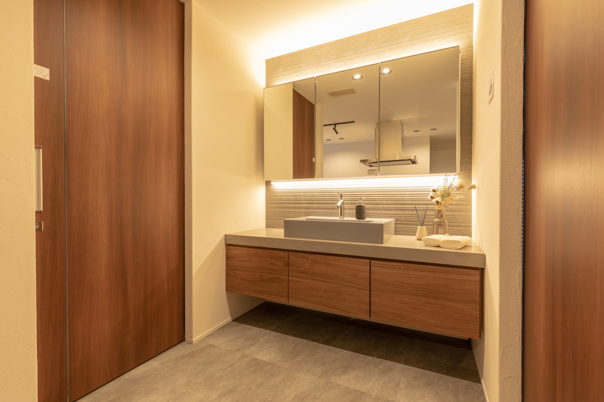 木目とグレーを基調とした洗面スペースは、間接照明の柔らかな光で上品な空間に。スクエア型の洗面ボウルやフロートタイプのカウンターが、すっきりとした印象を与えます。