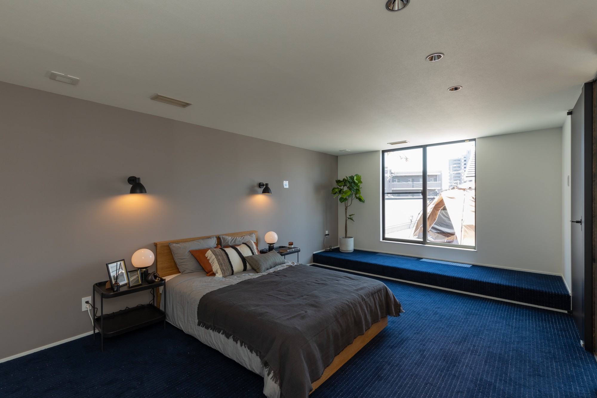 落ち着きのあるグレージュの壁に、深みのあるネイビーカーペットを合わせた上質な寝室。大きな窓から差し込む自然光が空間を明るく包み込み、心地よい開放感とプライベートな安らぎを両立。