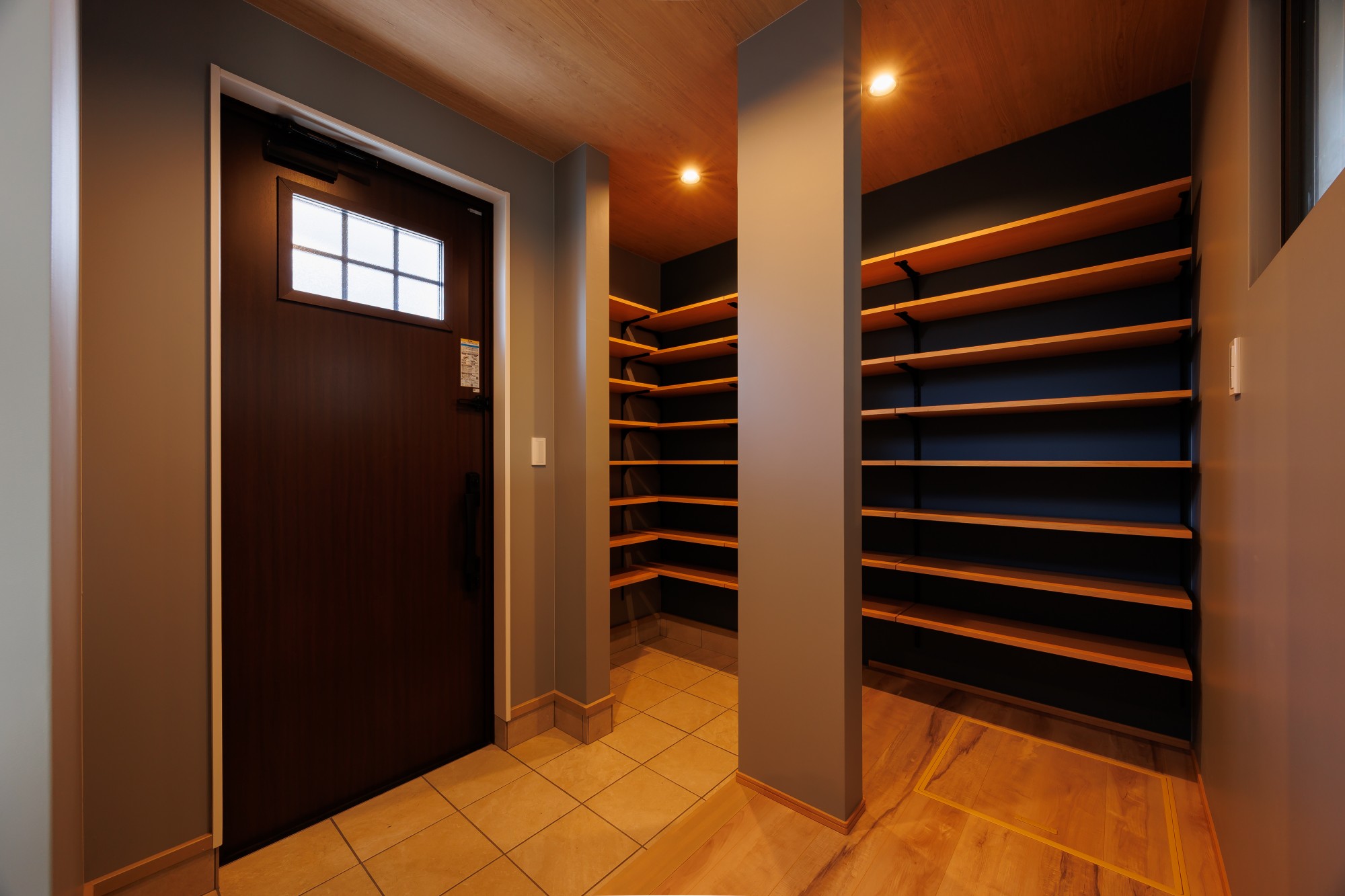 たっぷりの可動棚を備えたシューズクロークで、靴やアウトドア用品もすっきり収納。