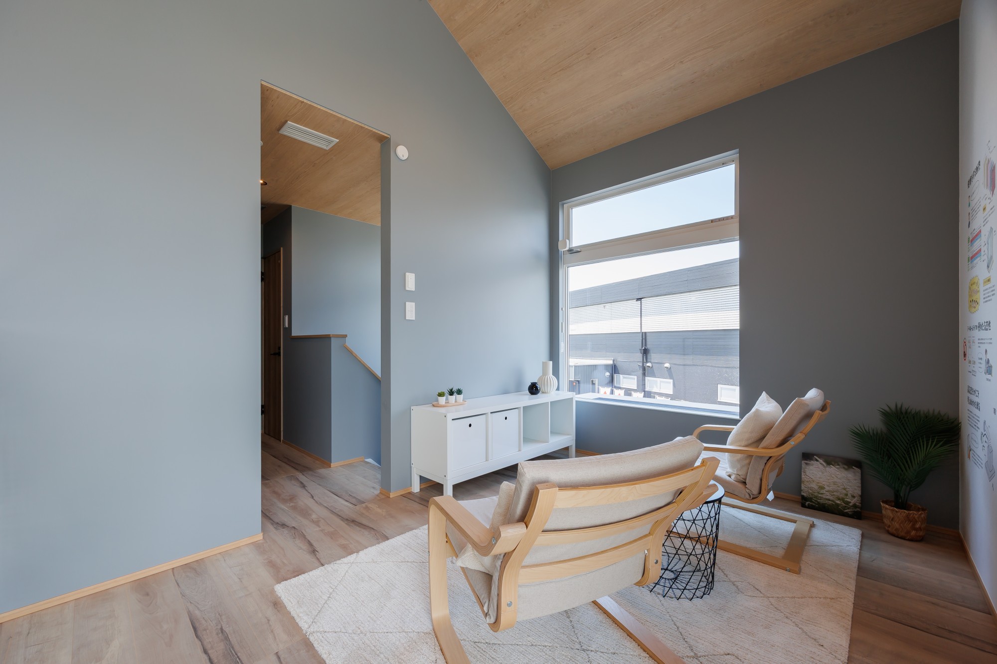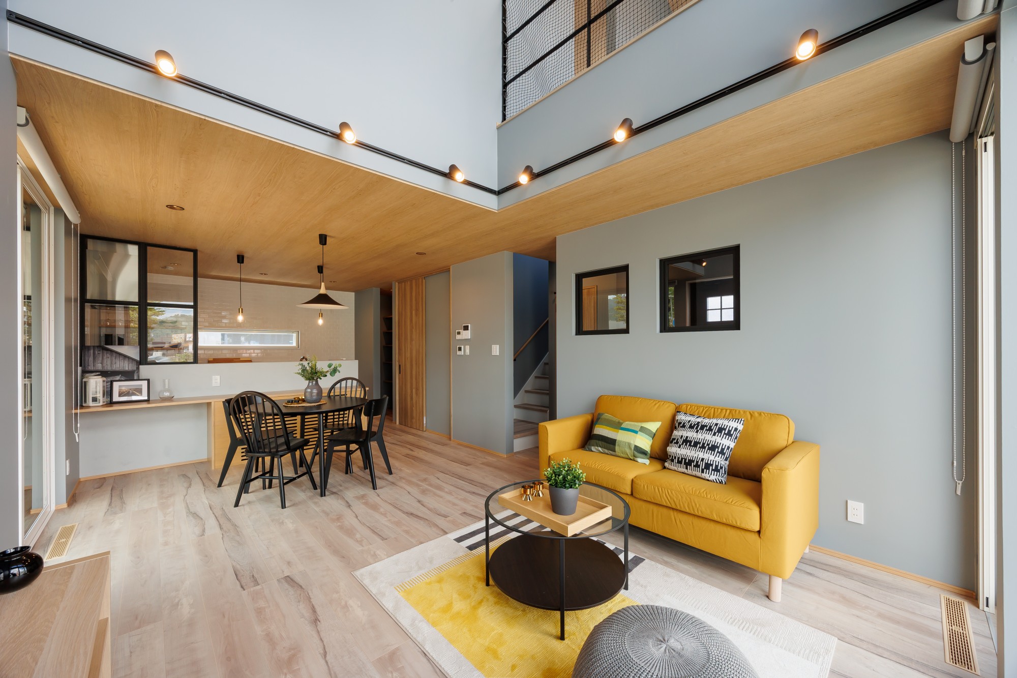 グレーと木のコントラストが映える、吹き抜けリビング。