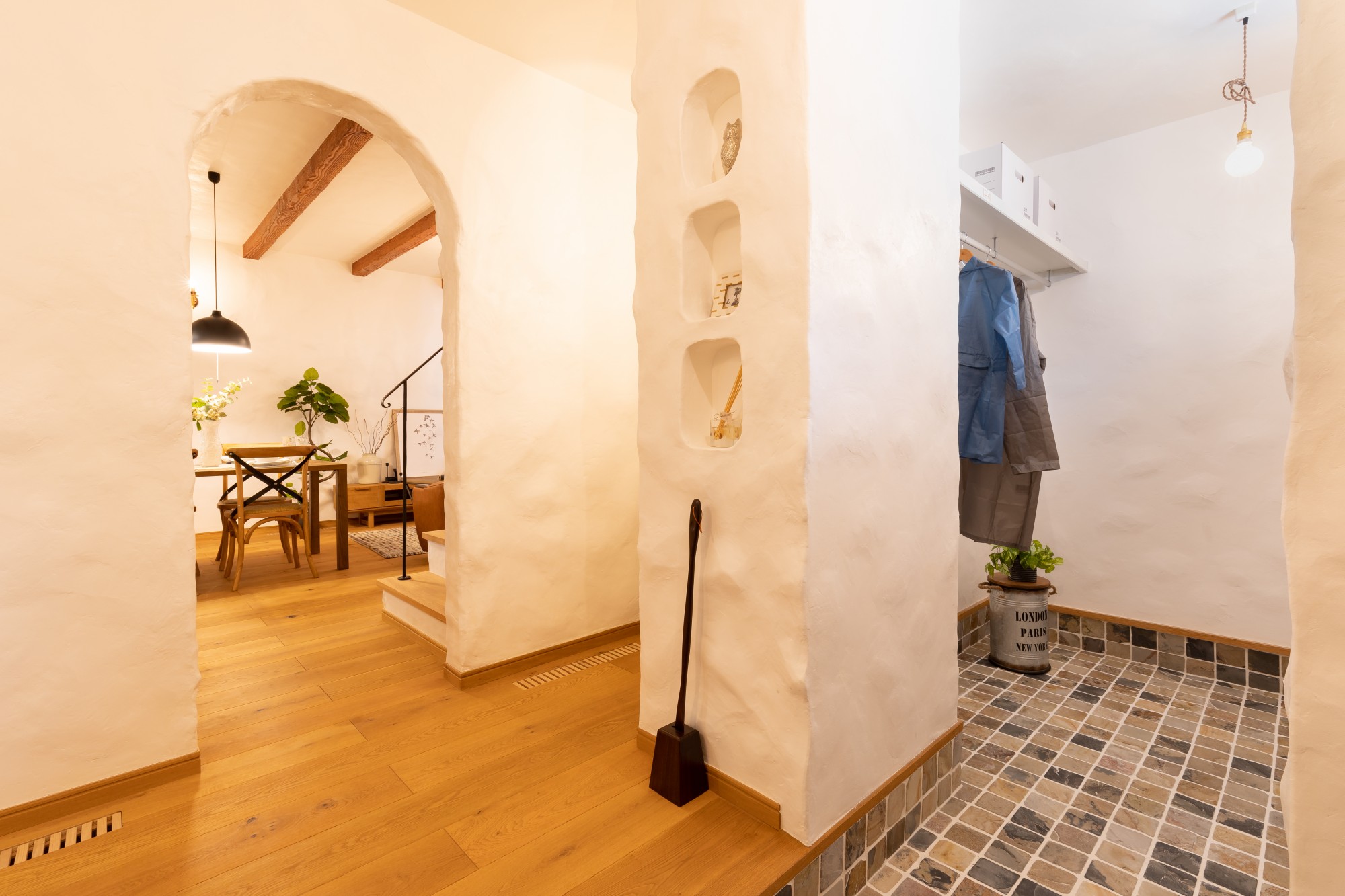 やわらかな曲線のアーチと手塗りの漆喰壁が印象的な玄関ホール。