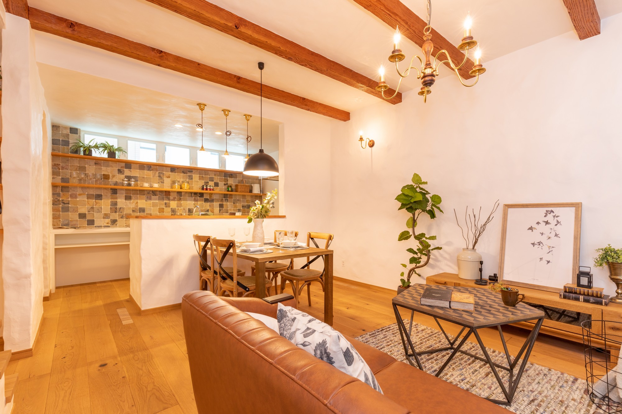 天井の化粧梁や真鍮の照明、漆喰壁の質感が調和したLDK。ナチュラルな無垢の床が足元からぬくもりを伝え、家全体を包み込むような落ち着きを感じさせます。