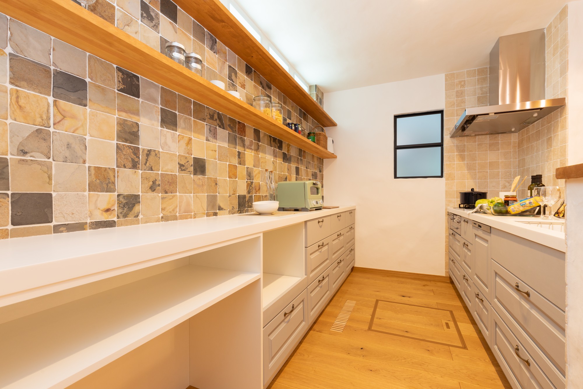 キッチンとカウンターを分けたⅡ型レイアウト。木のオープン棚と白いカウンターが明るさと優しさを添え、料理をする時間が心地よくなるデザインで、アンティークな雰囲気を引き立てています。