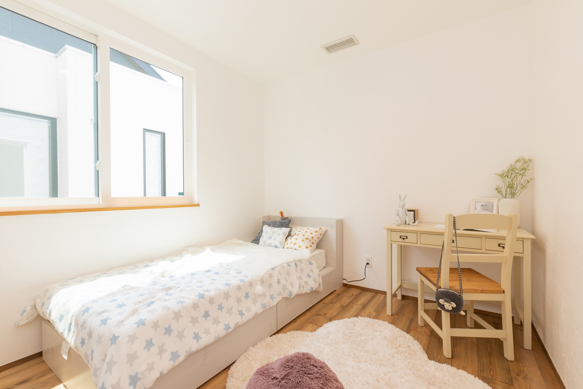 大きな窓から差し込む自然光が白い壁に反射し、明るく清潔感あふれる空間に。素朴でシンプルなインテリアだからこそ、年月を重ねるごとに味わいが増す空間です。