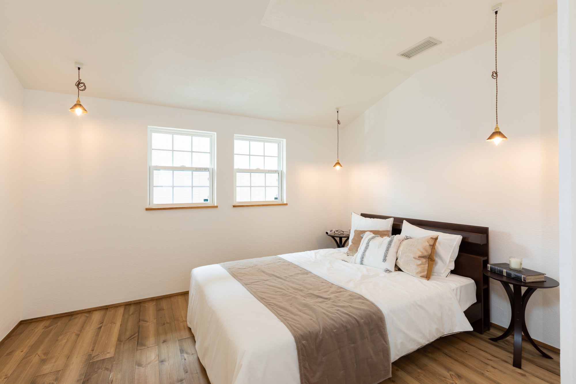 漆喰のやわらかな白壁と、木の床が落ち着きを感じさせる主寝室。左右に吊るした真鍮のペンダントライトが穏やかに光り落ち着く空間に。