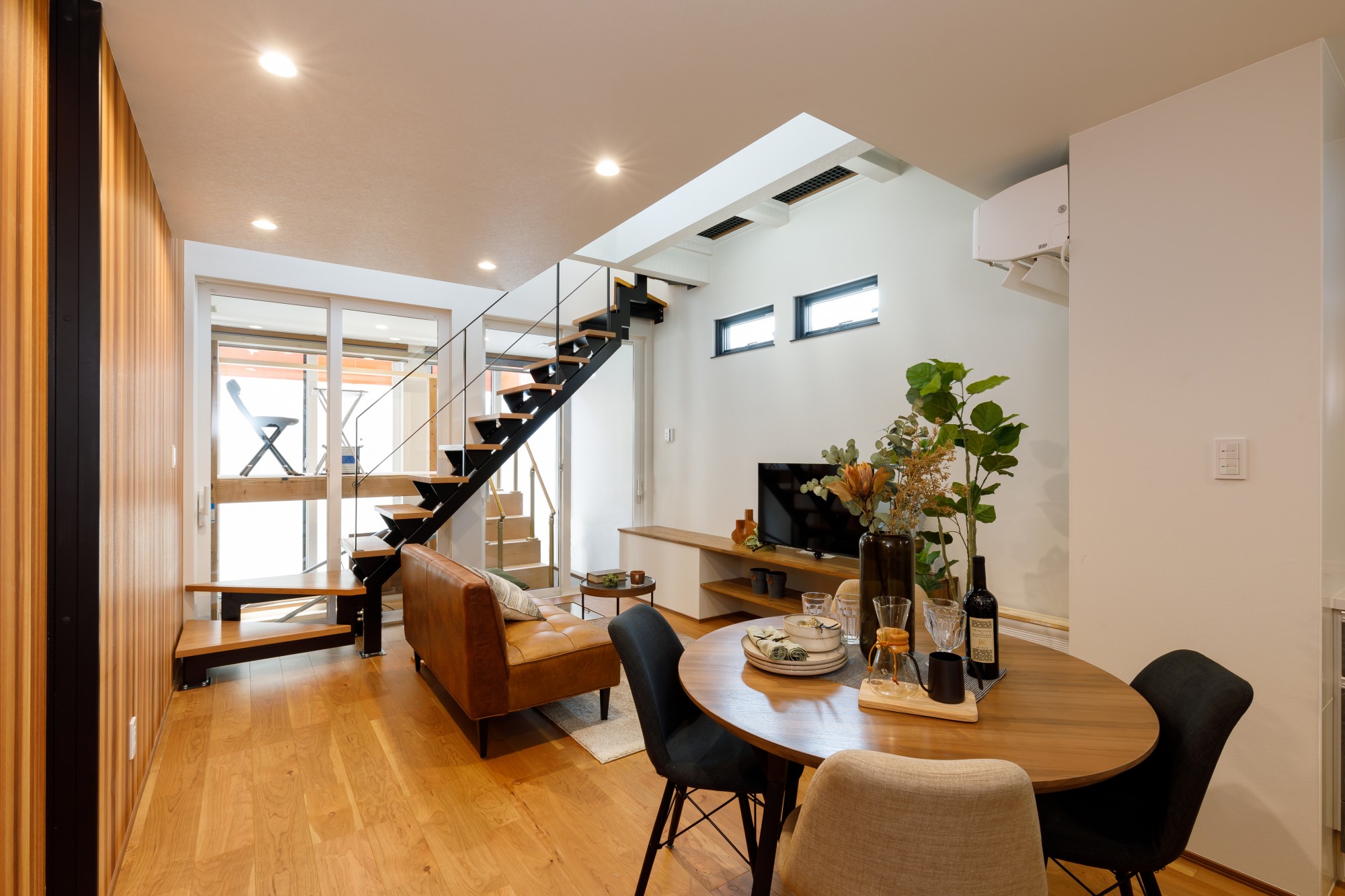 リビングから階段へとつながる視線が広がり、家全体に一体感を生み出します。