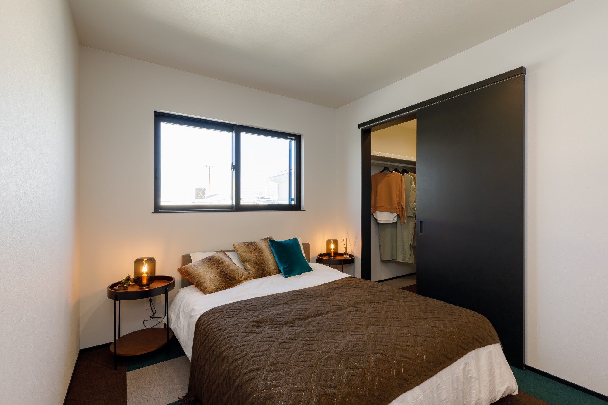 ダークブラウンとブラックを基調にした、上質な寝室空間。