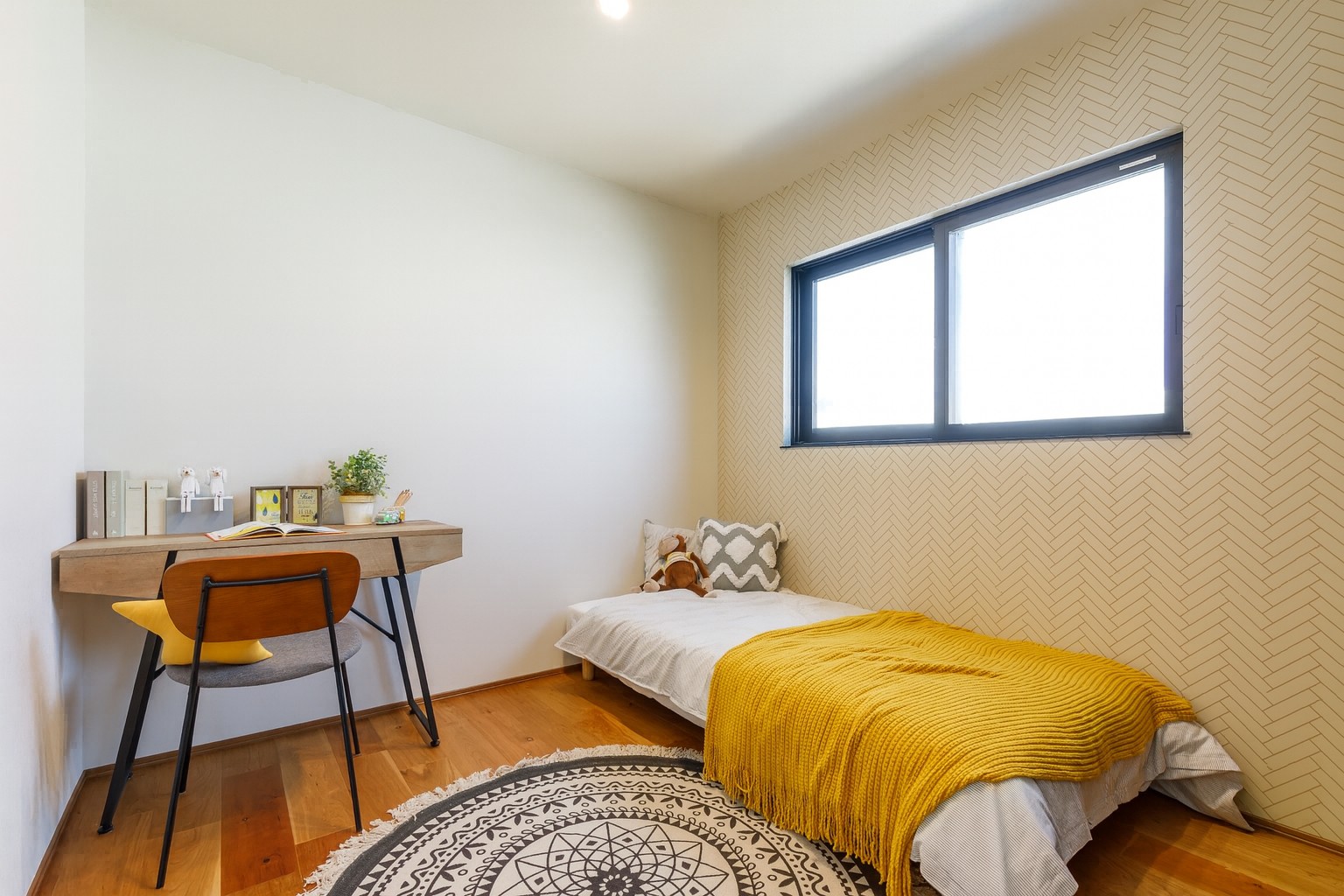 木の床とやさしいベージュのアクセントクロスが調和した、明るい洋室。
