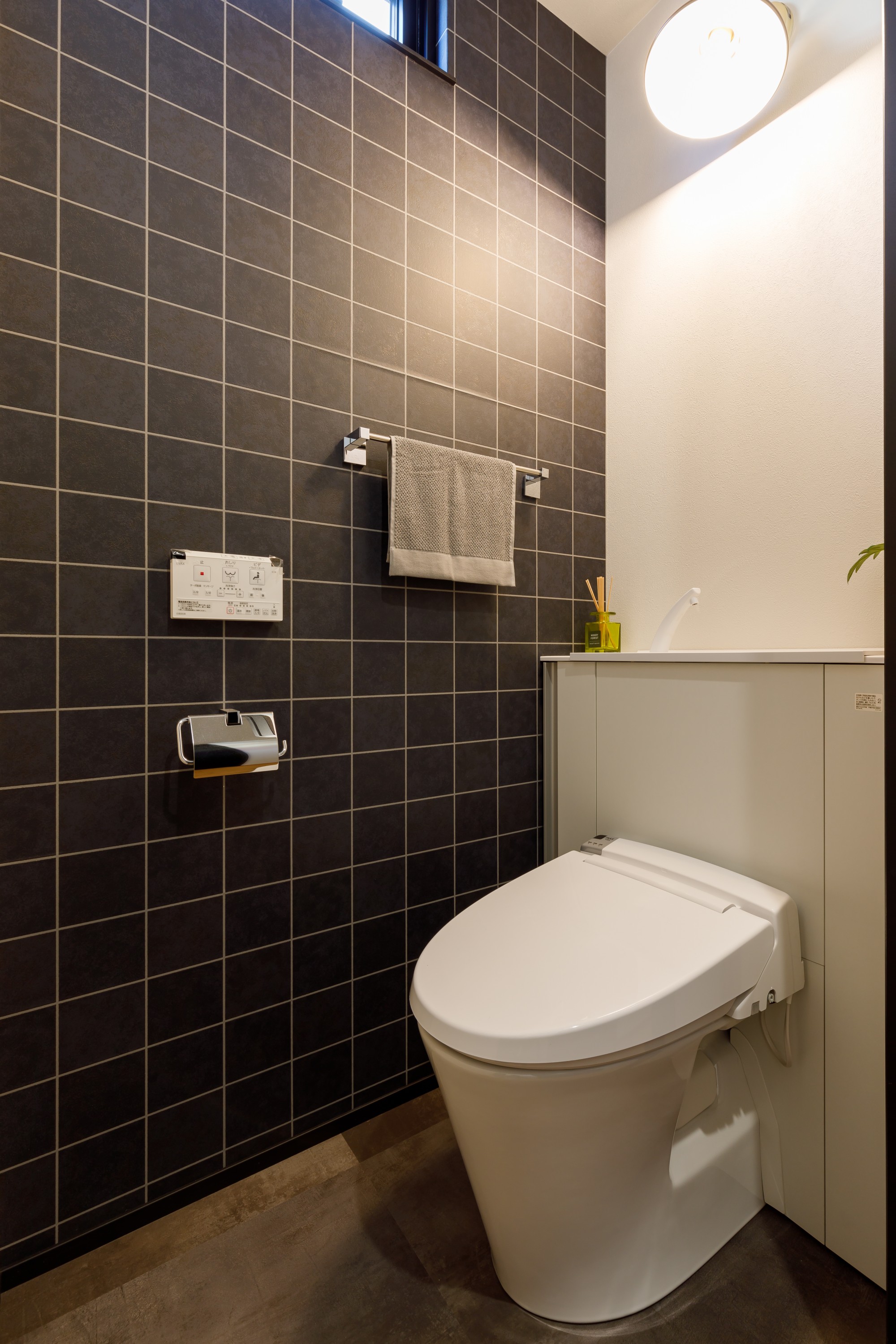 ダークタイルとホワイトのコントラストが美しい、上質なトイレ空間。