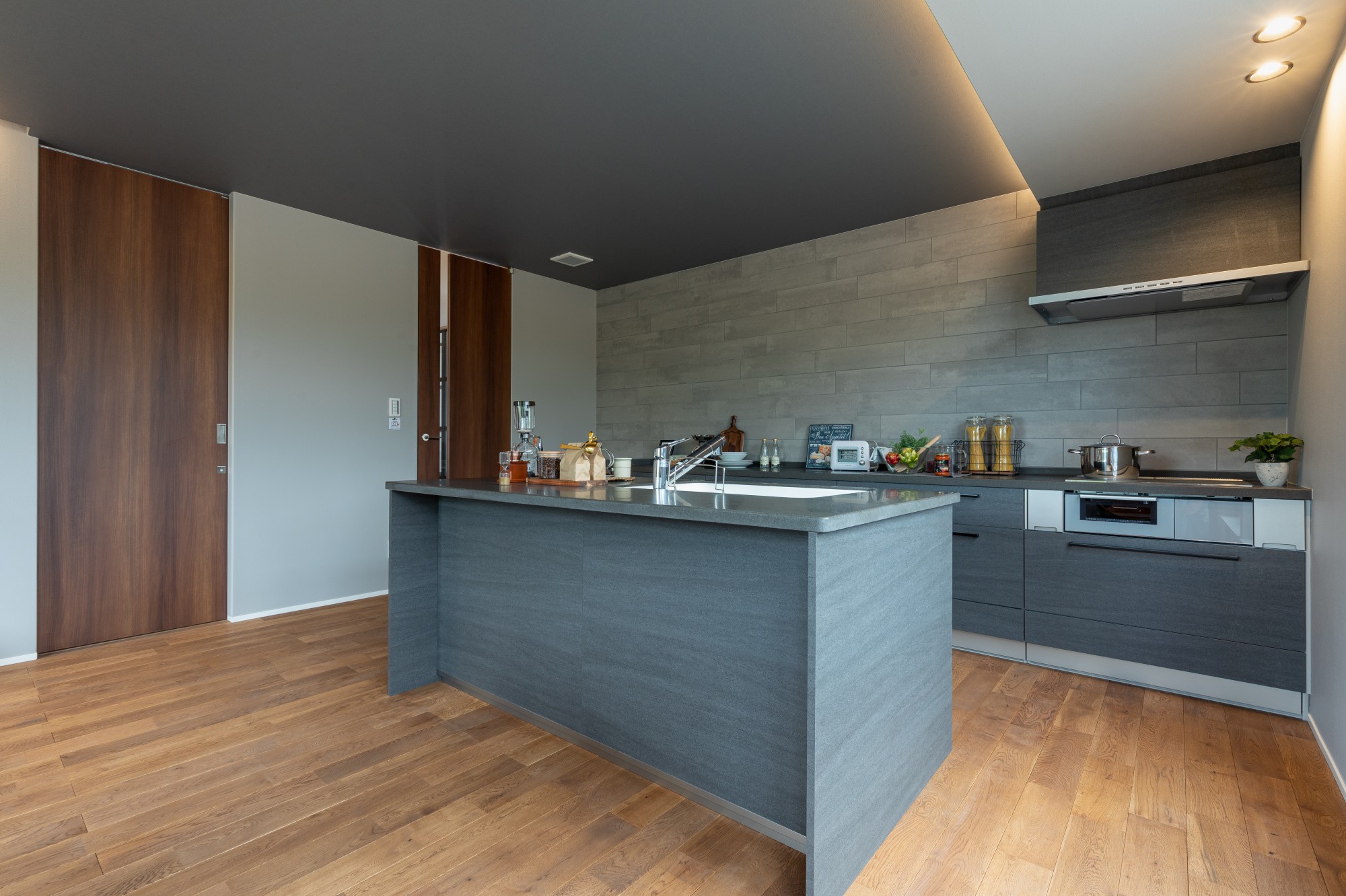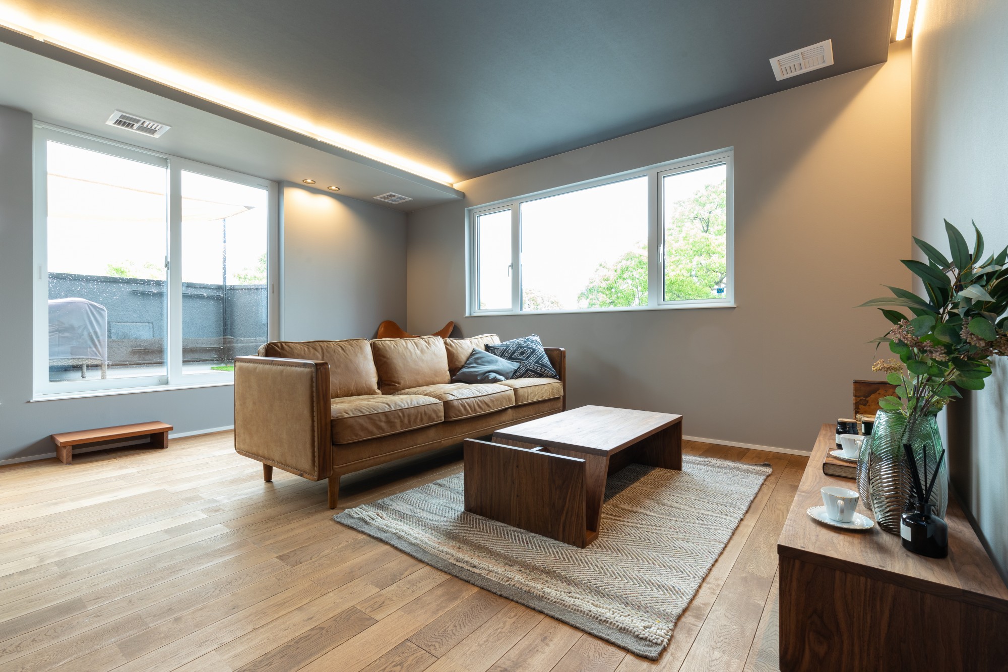グレーの天井と木の床が美しく調和する、上質なリビング。