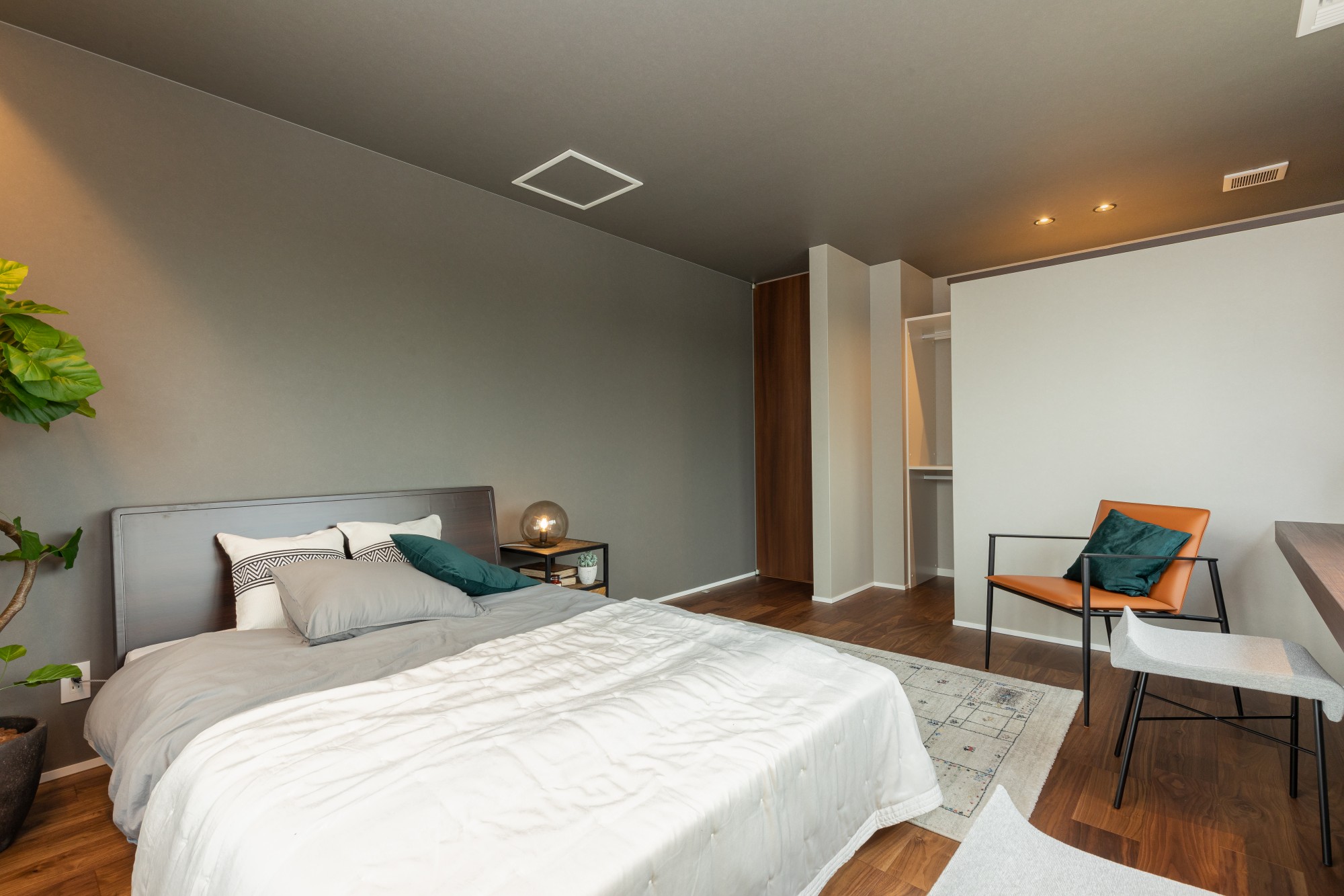 落ち着いた配色と間接照明が美しい、モダンな主寝室。