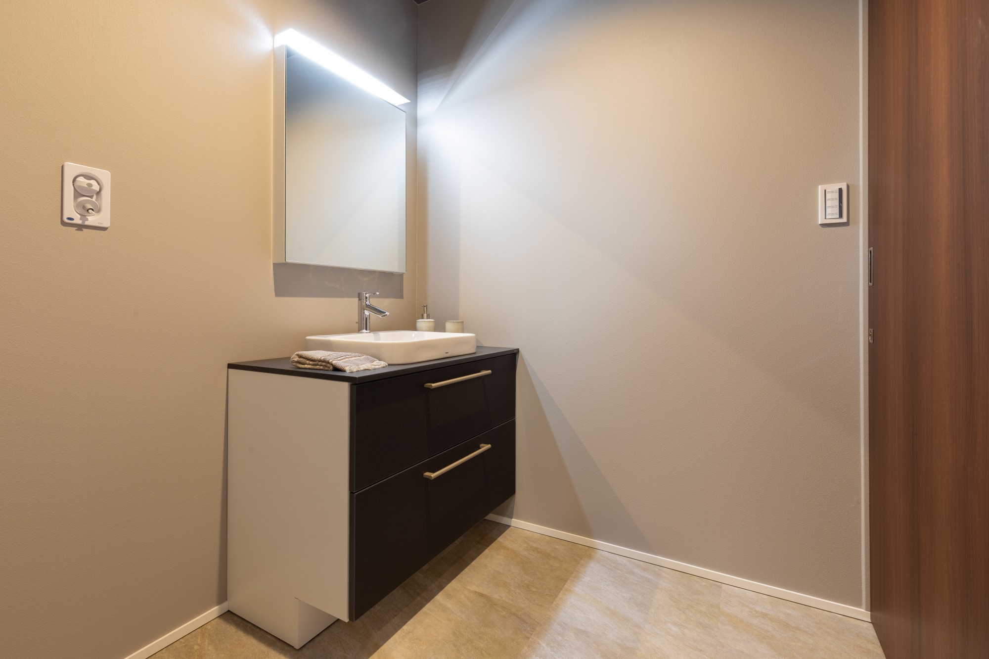 やわらかな照明とマットな質感が調和した、上品な洗面スペース。