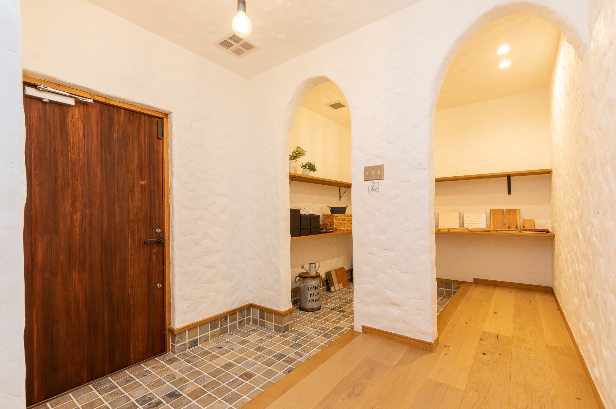塗り壁の質感とアーチ開口が美しい、ナチュラルで温かみのある玄関ホール。