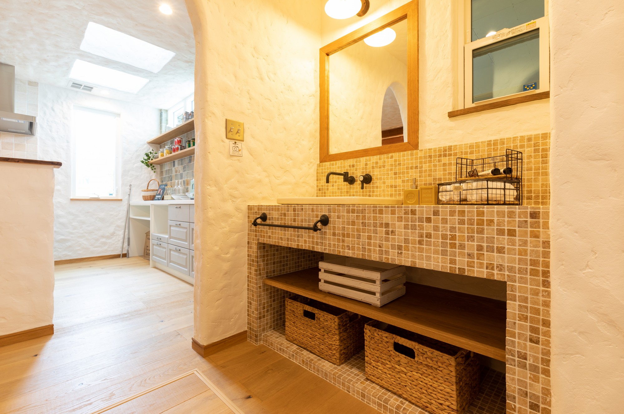 小さなタイルをあしらった造作洗面台が印象的な、ナチュラルで温もりのある空間。