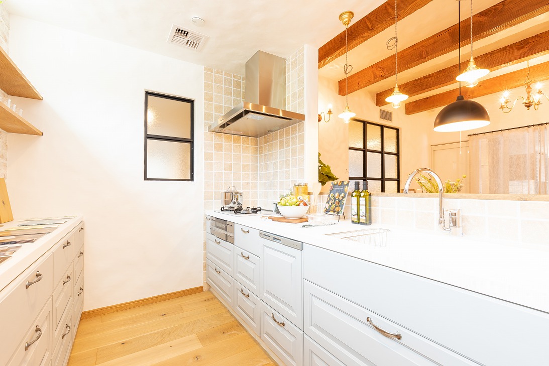 白を基調にした明るいキッチンに、木梁とタイルの温もりをプラス。
