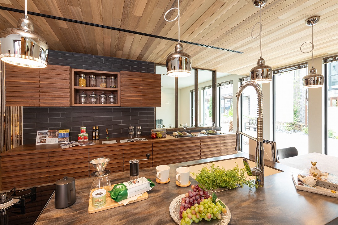 木目のぬくもりとブラックタイルの重厚感が調和した、上質なキッチン。