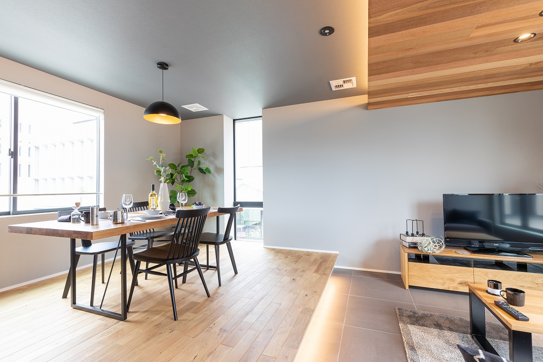 グレーの天井と木の質感が調和する、落ち着いた大人の空間。