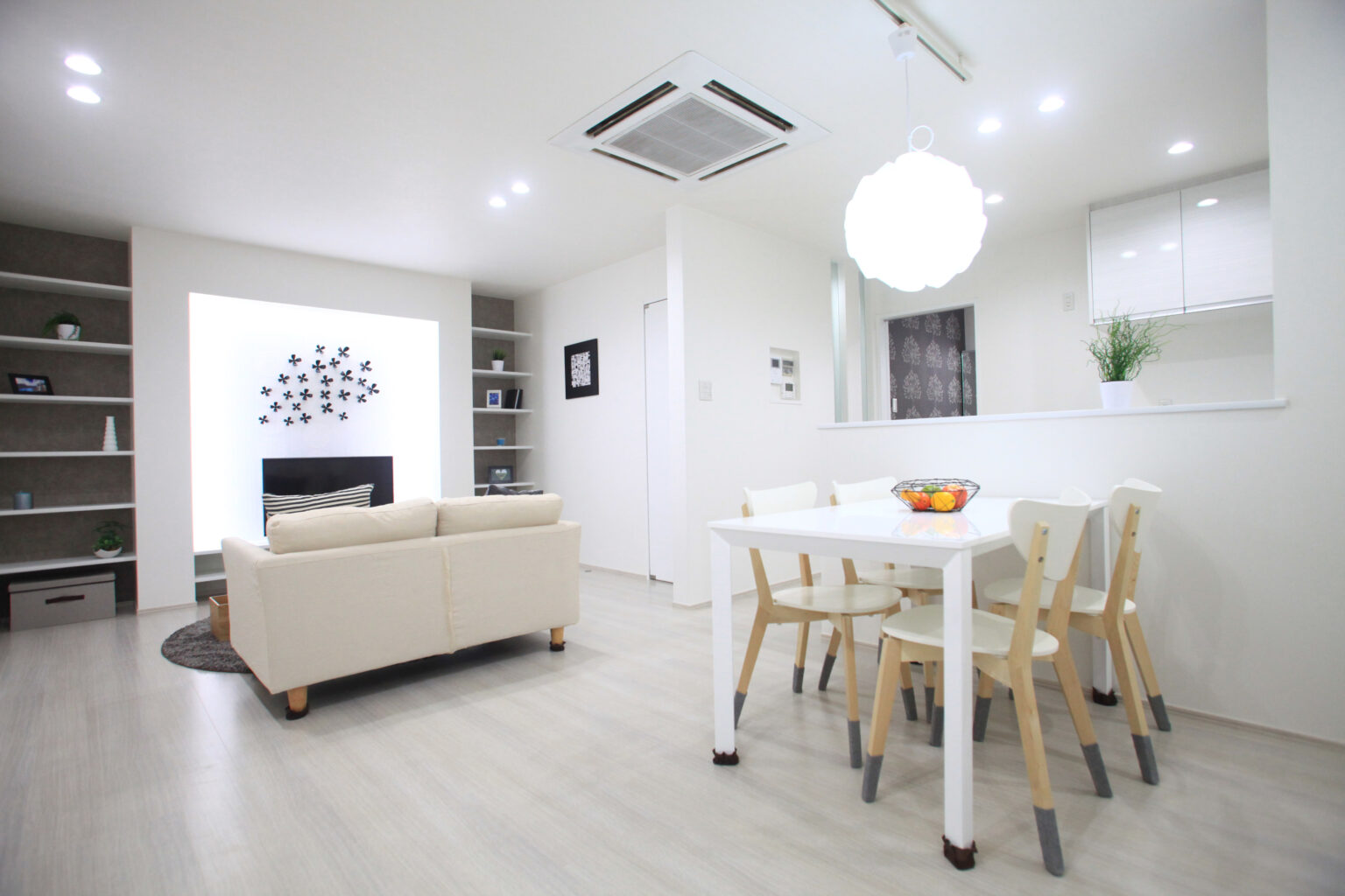 やわらかな白とナチュラルな木目が調和する、すっきりと美しい空間構成。