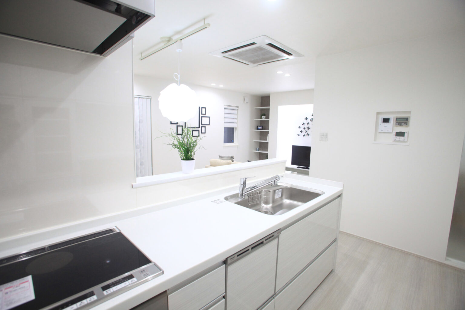 白を基調にした明るいキッチンは、空間全体を広く感じさせるデザイン。