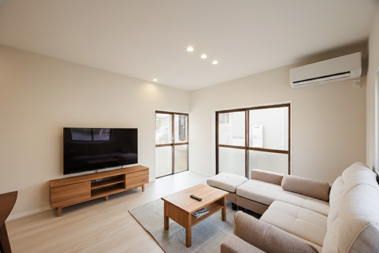 大きな窓から自然光がたっぷり差し込む、明るく開放的なリビング空間。