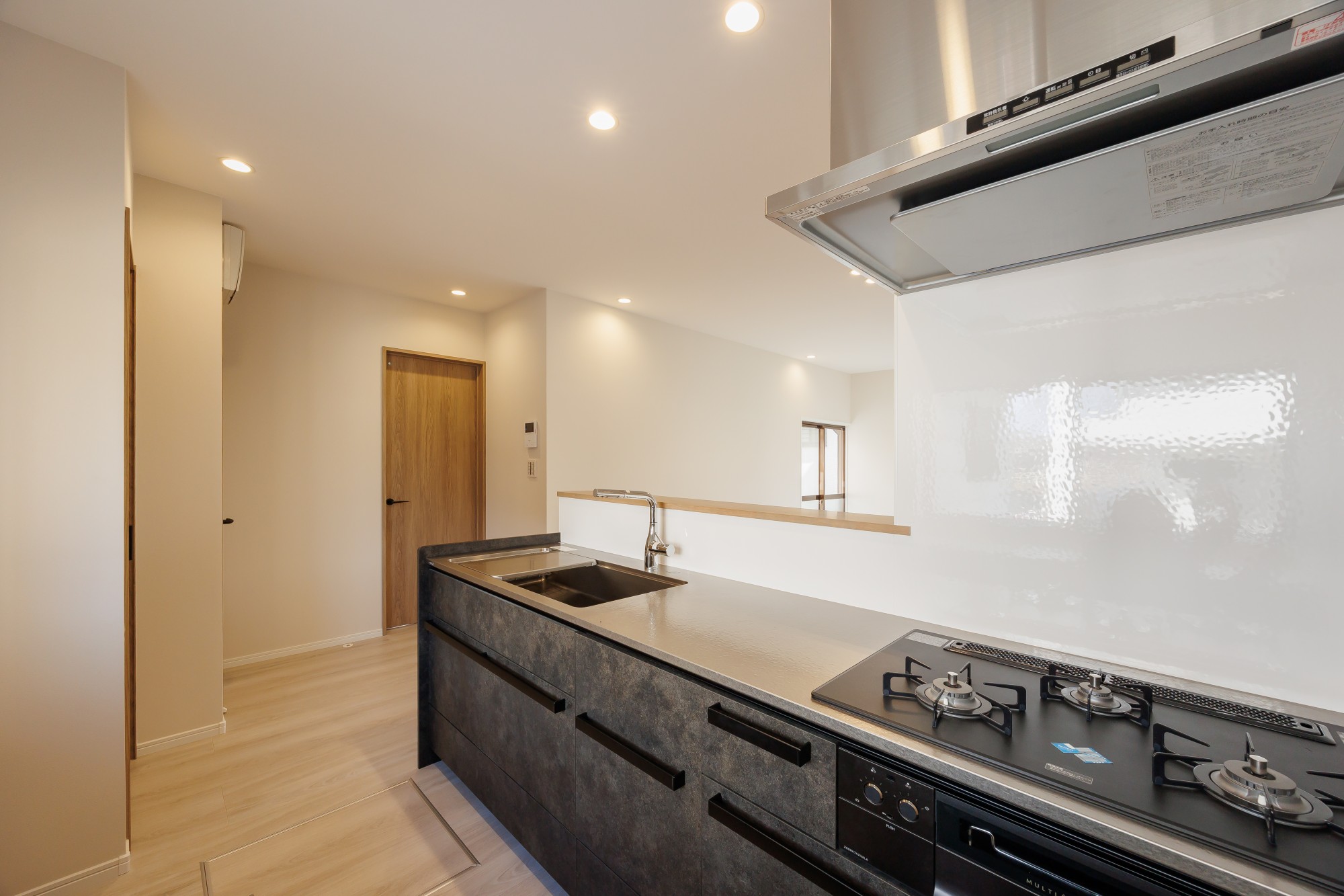 落ち着いた質感のキッチンと木のぬくもりが調和した、スタイリッシュな対面キッチン。
