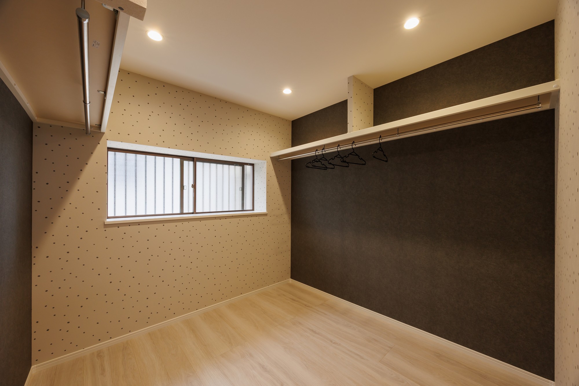 落ち着いたアクセントクロスが印象的なウォークインクローゼット。