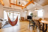 クローゼットも各所に配置しすっきり収納することにより広々すっきりのLDKが実現しました。勾配天井にすることにより、かなり広く感じられます。見せ梁にハンモックをぶら下げ、お子さんたちも大喜びでした。
