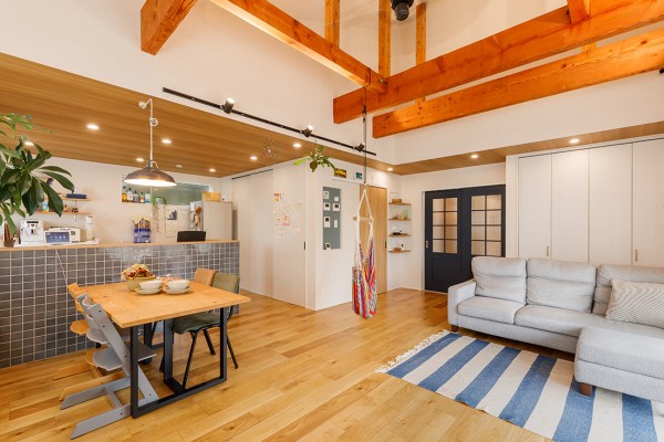 天井を思い切り高くし、梁を見せることでより開放的な空間になりました。