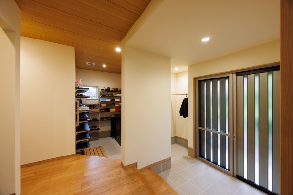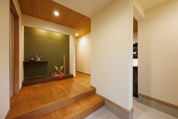 さらに、奥様の「季節の花を飾れる玄関にしたい」というご希望から、玄関には飾り棚を設置。四季折々の草花や小物を楽しめる、心が華やぐ空間に仕上がっています。