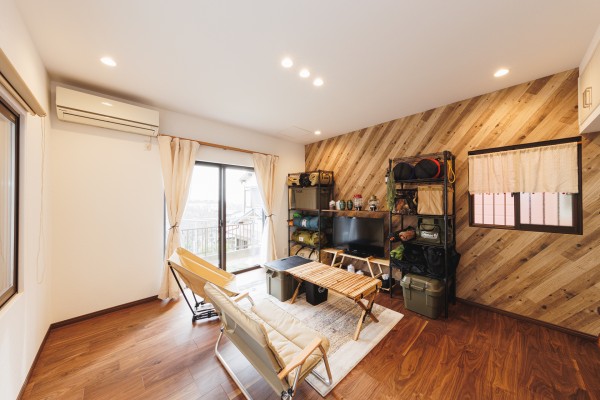 キャンプ等のアウトドアが趣味のご家族。お家でも趣味を楽しんでいただける空間をご提案しました。
