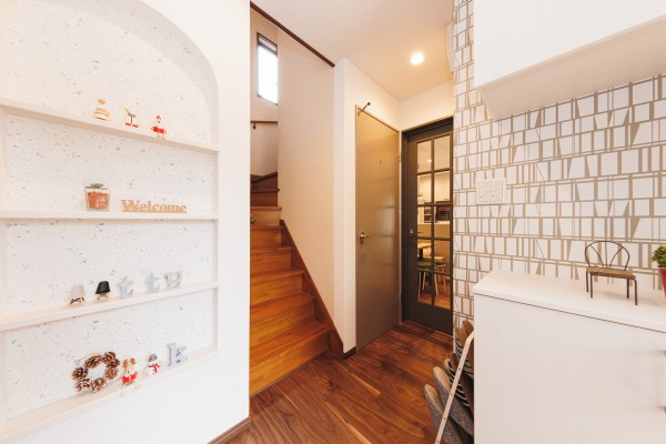 玄関は大きなシューズボックスで収納の悩みを解消しニッチを設けて印象的なフォーカルポイントにしました。